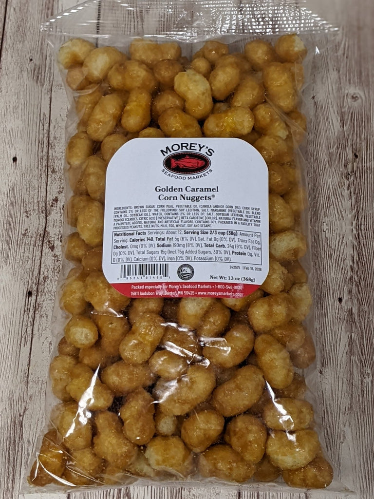 Morey’s brand golden caramel corn nuggets, a sweet treat! 13oz bag.